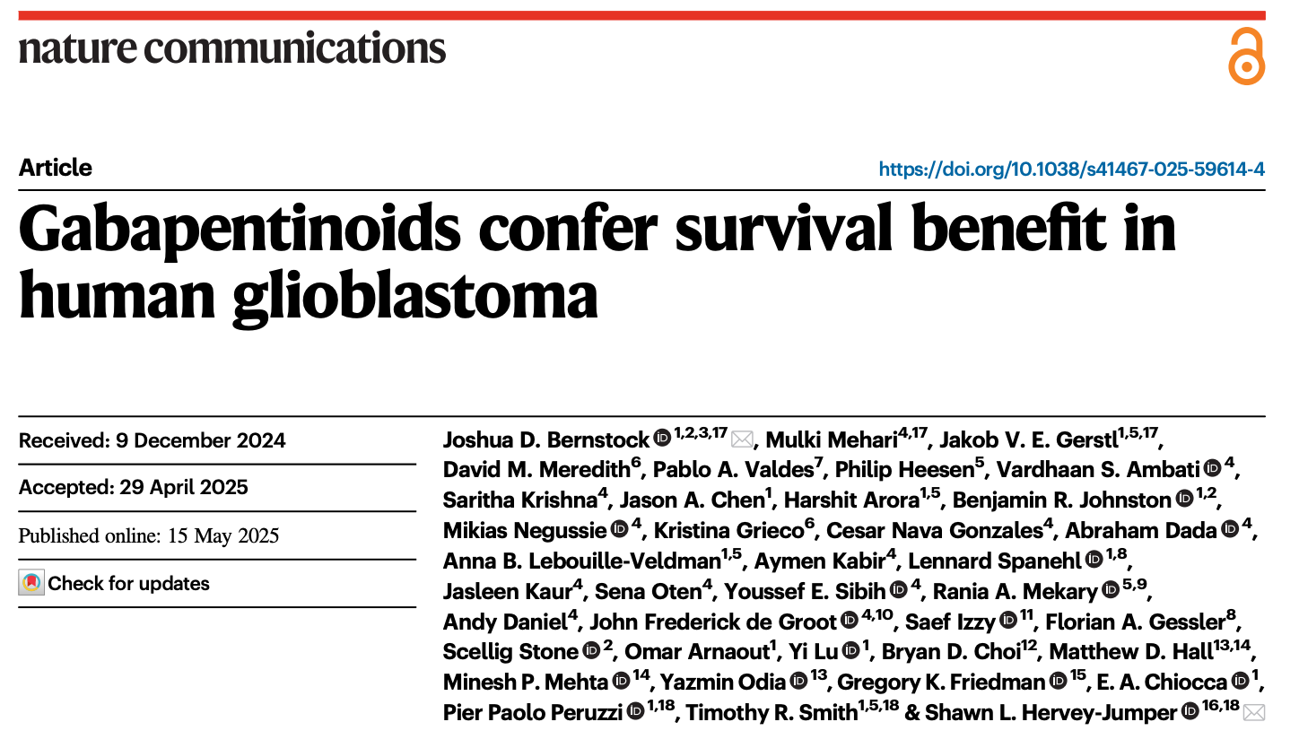 Bernstock JD, Mehari M, E Gerstl JV, Meredith DM, Valdes PA, Heesen P, Ambati VS, Krishna S, Chen JA, Arora H, Johnston BR, Negussie M, Grieco K, Nava Gonzales C, Dada A, Lebouille-Veldman AB, Kabir A, Spanehl L, Kaur J, Oten S, Sibih YE, Mekary RA, Daniel A, de Groot JF, Izzy S, Gessler FA, Stone S, Arnaout O, Lu Y, Choi BD, Hall MD, Mehta MP, Odia Y, Friedman GK, Chiocca EA, Peruzzi PP, Smith TR, Hervey-Jumper SL.